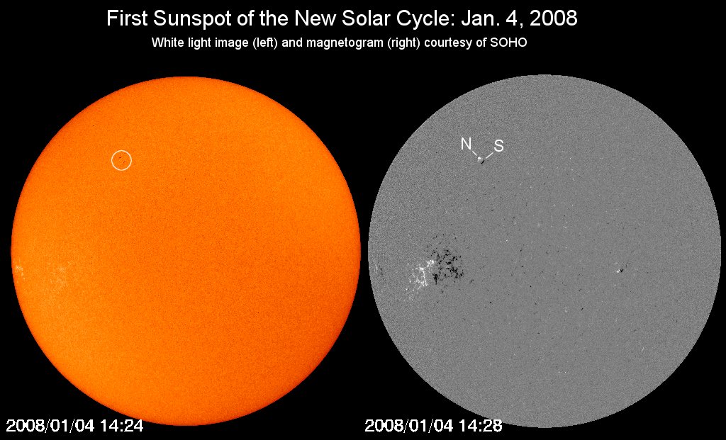 Päikesel algas eile (03.01) uus tsükkel, kui avastati, et juba varem näha olnud vastupidise polaarsusega "magnetsõlm" on tekitanud lõpuks ka Päikese laigu. Uus tsükkel kannab järjenumbrit 24. Uue tsükli esimene laik: