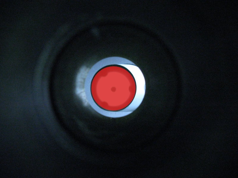 Sekundaarpeegel peaks paistma perfektse ringina. Tegin kaameraga pildi, lisasin Gimp'is ketta (punane) ja selgus, et see on veidi lopergune.