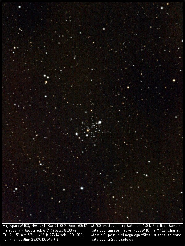 Iga kaadri säri oli 15 sekundit, ISO 1600 ja kõlblike kaadreid sain kokku 12. Teleskoobiks on TAL-2 1200mm F8