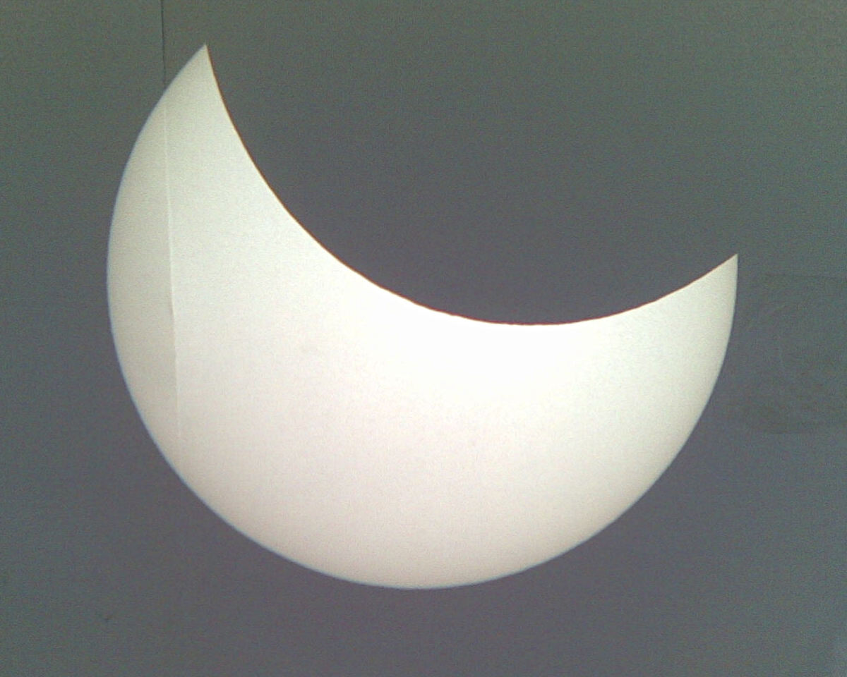 Niimoodi nägi välja päikesevarjutus läbi teleskoobi TAL-2, näidatuna valgele ekraanile. Pildistamiseks kasutasin telefoni Nokia E51 kaamerat, kell näitas 12:53 Ida-Euroopa suveaja järgi:
