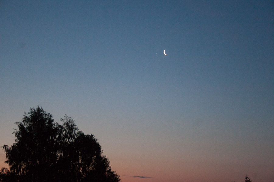 Kuu, Jupiter ja Veenus 15. juulil 2012 hommikutaevas. Kuu hakkab Jupiteri katma.